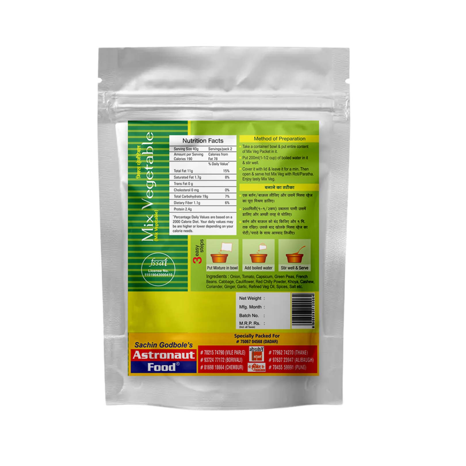 Ingredients - Onion, Tomato, Cauliflower, Capsicum, Cabbage, Green Peas, Carrot, French Beans, Garlic, Ginger, Coriander, Red Chilli Powder, Refined Vegetable Oil, Salt, Spices