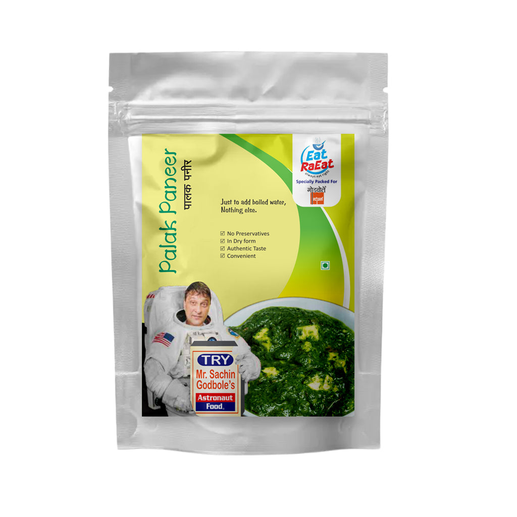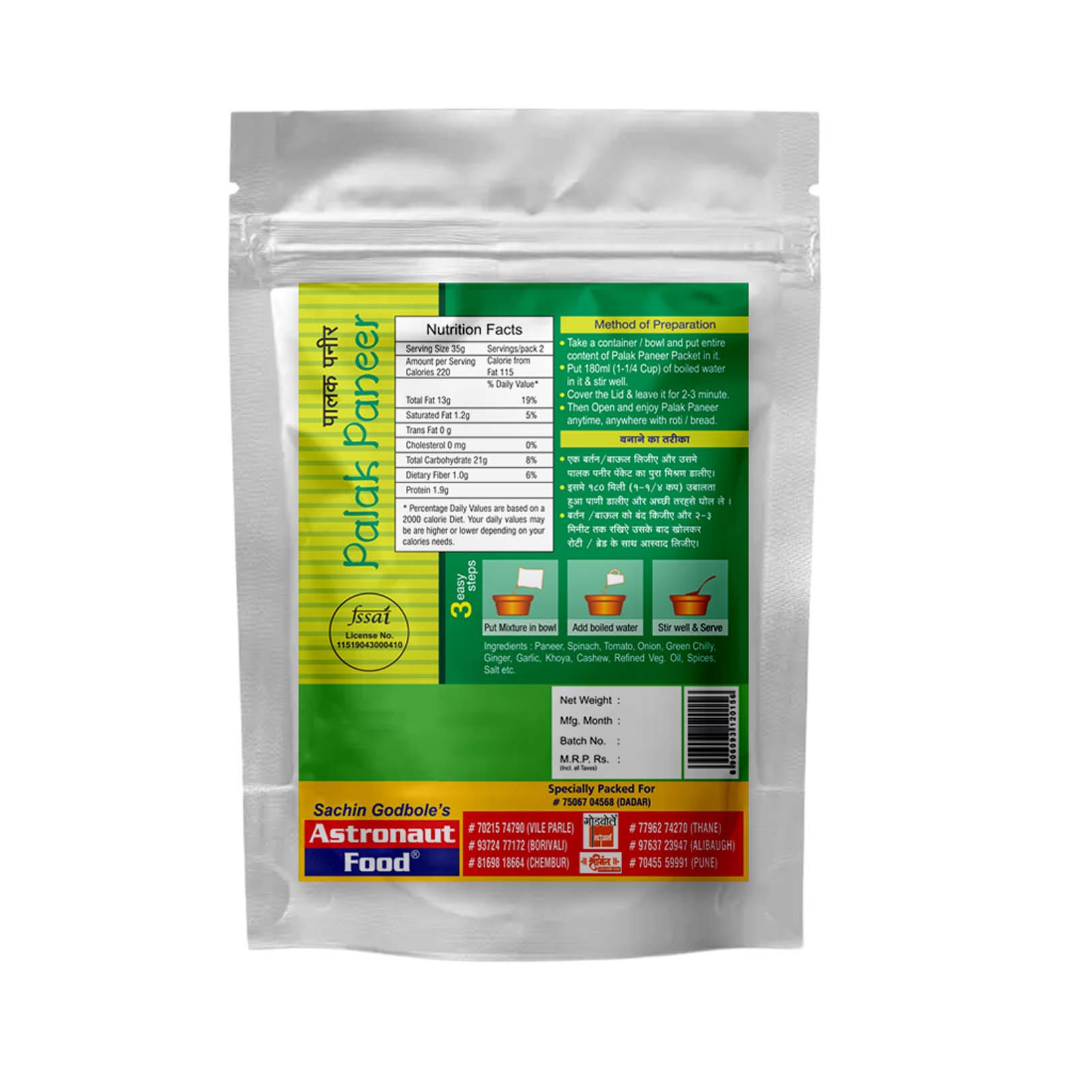 Freeze Dried Palak Paneer - Main Course Paneer Base Dish With Palak As The Main Ingredient. Healthy And Tasty Dish With The Goodness Of Palak And Paneer. Can Be Consumed With Roti Or Rice. Net Weight 70g. Rehydrated Weight 250g. Medium Spicy. Approx Servings/Pack: 2