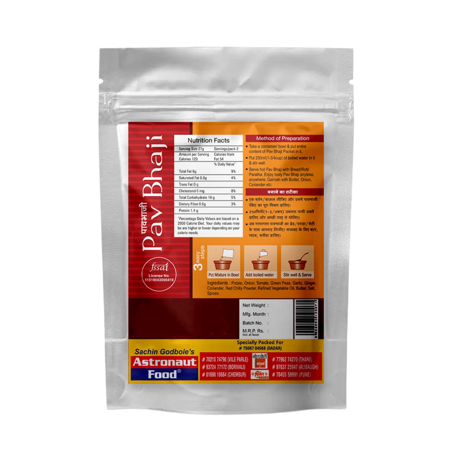 Freeze Dried Pav Bhaji - Popular Breakfast Dish. Can Be Consumed With Bread. Net Weight 55g. Rehydrated Weight 280g. Medium Spicy. Approx Servings/Pack: 2. Specialty Dish From Mumbai. Can Be Used For Pizza Base.