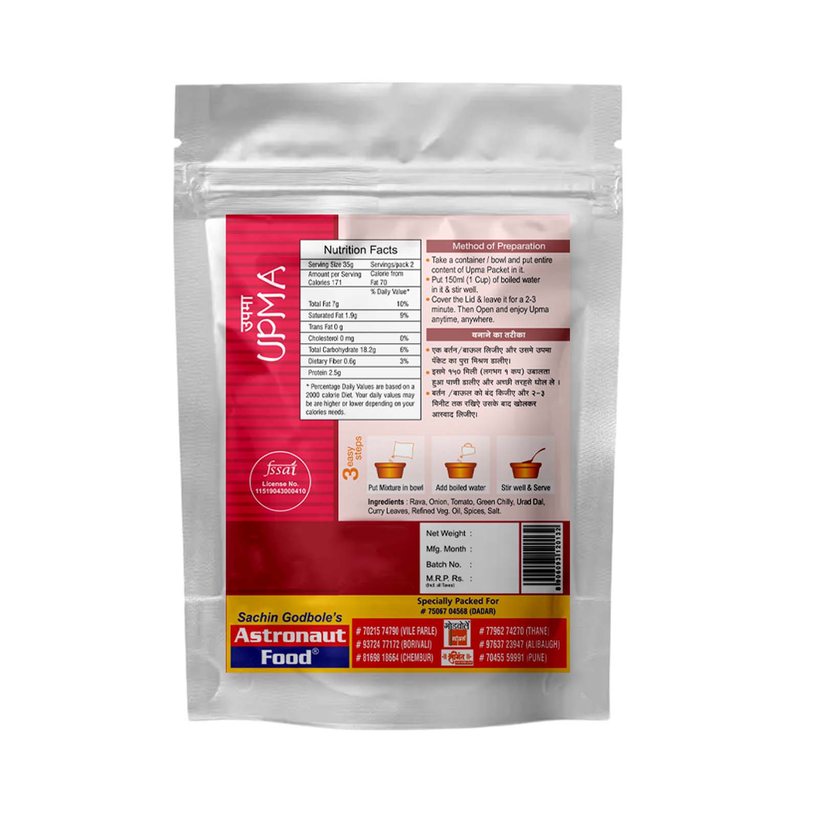 Freeze Dried Upma - Ideal All Time Snack And Breakfast Dish. Net Weight 70g. Rehydrated Weight 220g. Light Spicy. Approx Servings/Pack: 2. Specialty Dish From Maharashtra.