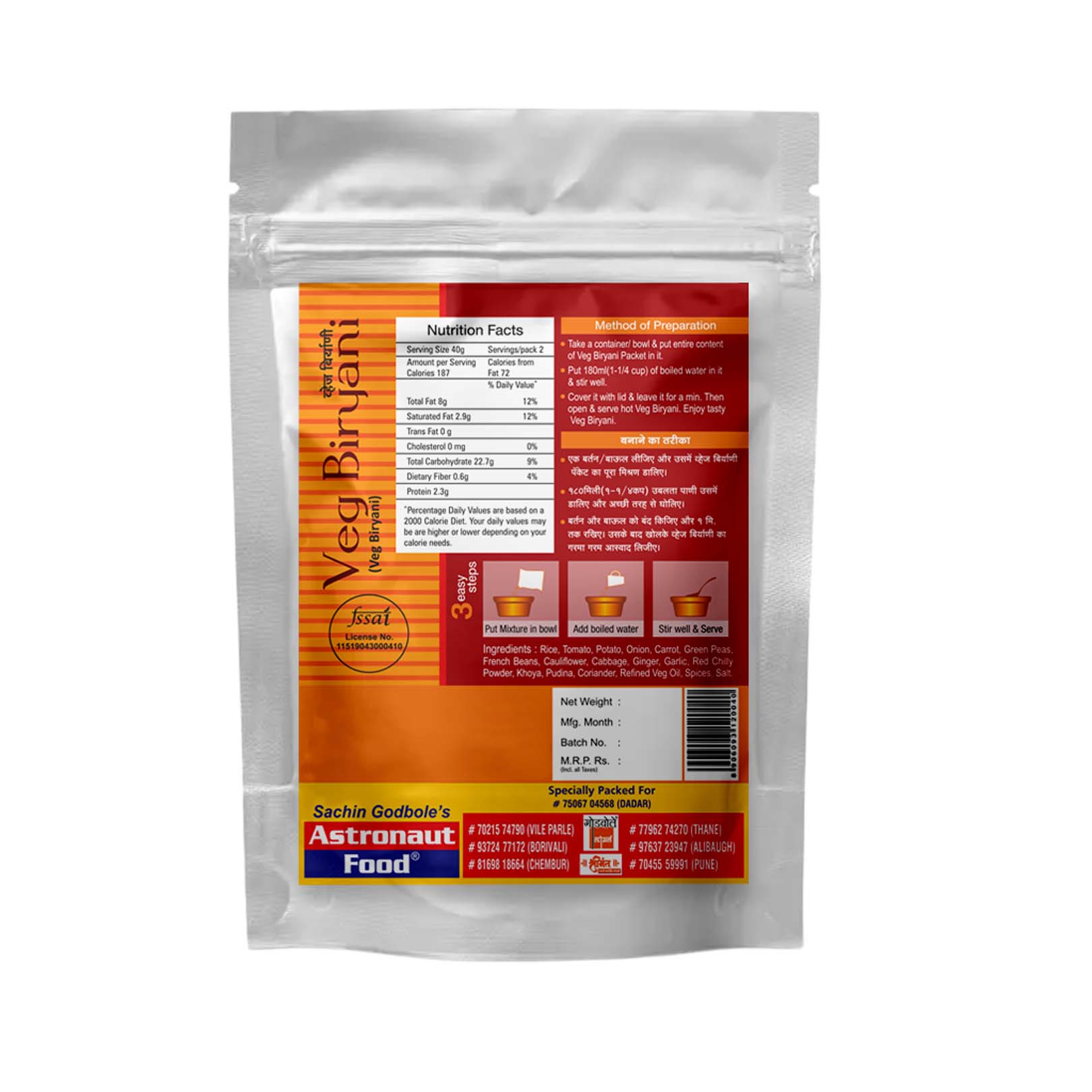Freeze Dried Veg Biryani - Main Course Dish From The Rice Category. Net Weight 80g. Rehydrated Weight 250g. Medium Spicy. Approx Serving/Pack - 2. A Popular Dish From The Rice Section
