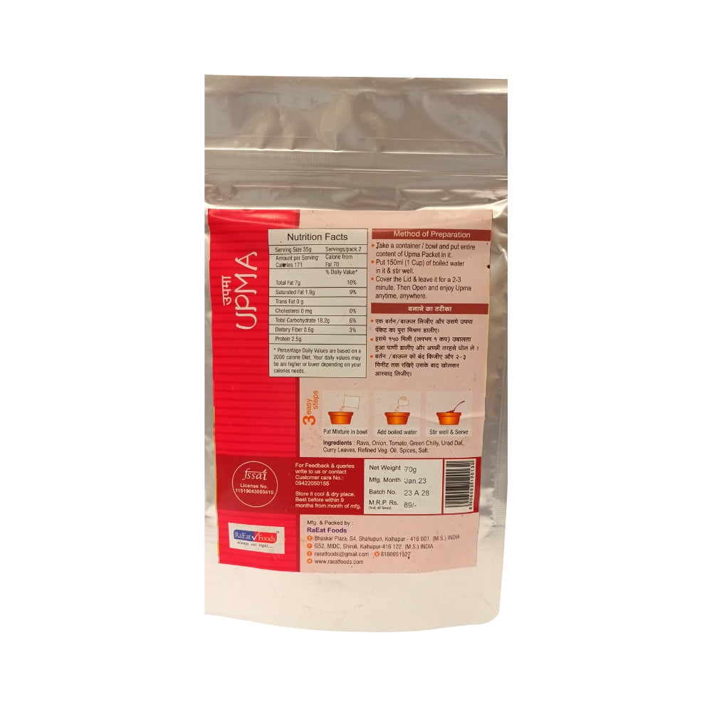 Freeze Dried Upma - Ideal All Time Snack And Breakfast Dish. Net Weight 70g. Rehydrated Weight 220g. Light Spicy. Approx Servings/Pack: 2. Specialty Dish From Maharashtra.