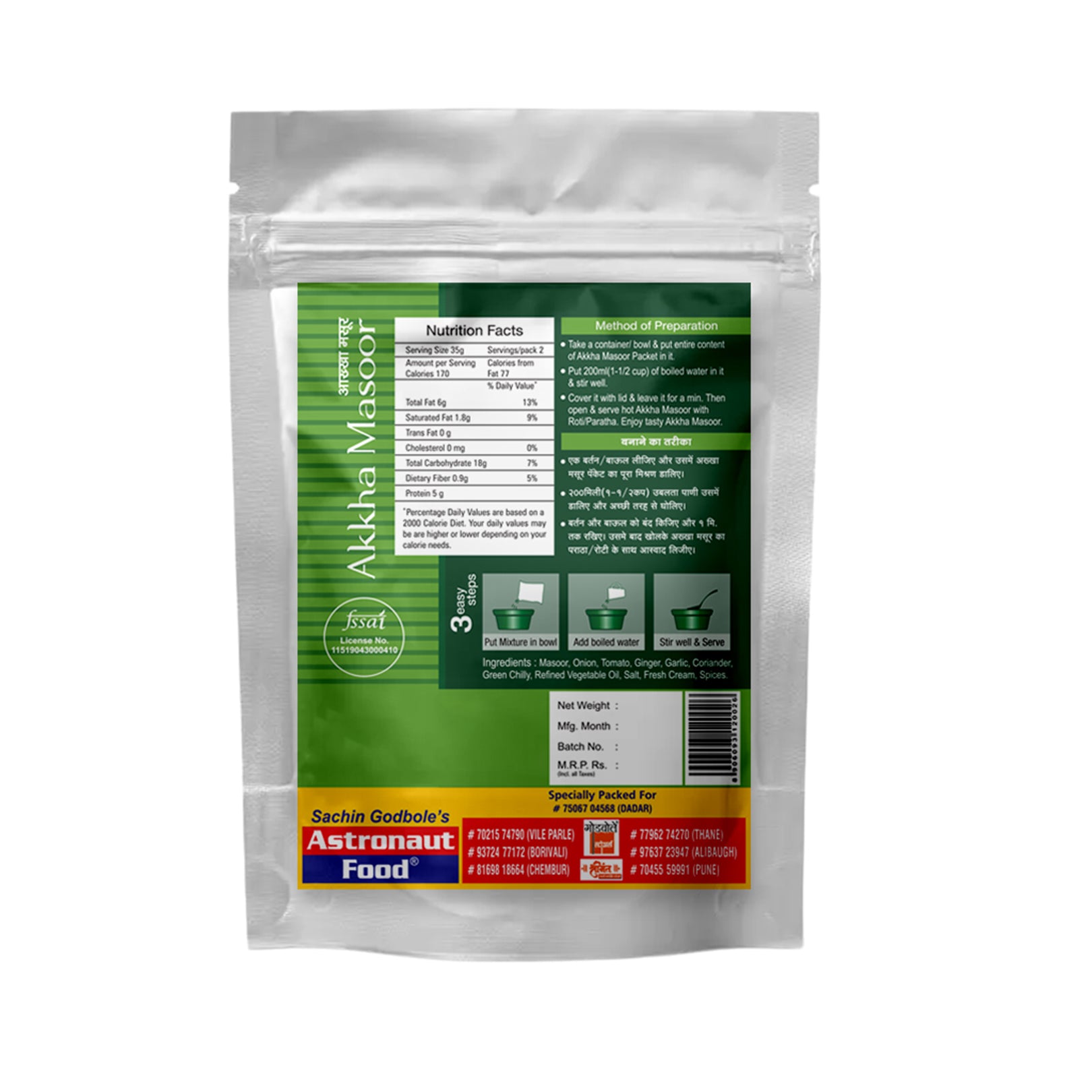 Freeze Dried Akkha Masoor - Main Course Dish From The Vegetable Category. Can Be Consumed With Roti Or Rice. Net Weight 70g. Rehydrated Weight 270g. Medium Spicy. Approx Servings/Pack: 2. Specialty Dish From Western Maharashtra.